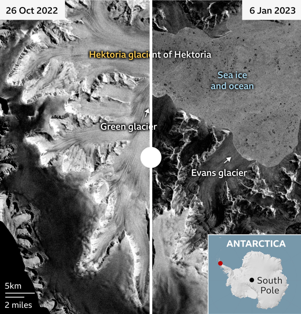 I dati satellitari mostrano che il ghiacciaio si è ritirato di circa 25 km tra gennaio 2022 e marzo 2023. Il caso ebbe inizio nel 2002, con il crollo di una piattaforma di ghiaccio chiamata Larsen B nella Penisola Antartica orientale. Circa 3250 kmq di ghiaccio andarono perduti. Larsen B aveva di fatto trattenuto il ghiacciaio Hektoria. Senza di lui, il movimento di Hektoria ha accelerato e il ghiacciaio si è assottigliato. Ma la baia lasciata libera dalla piattaforma di ghiaccio alla fine si è riempita di ghiaccio marino “fissato” al fondale marino, contribuendo in parte a stabilizzare Hektoria. Ciò è avvenuto fino all’inizio del 2022, quando il ghiaccio marino si è sciolto.