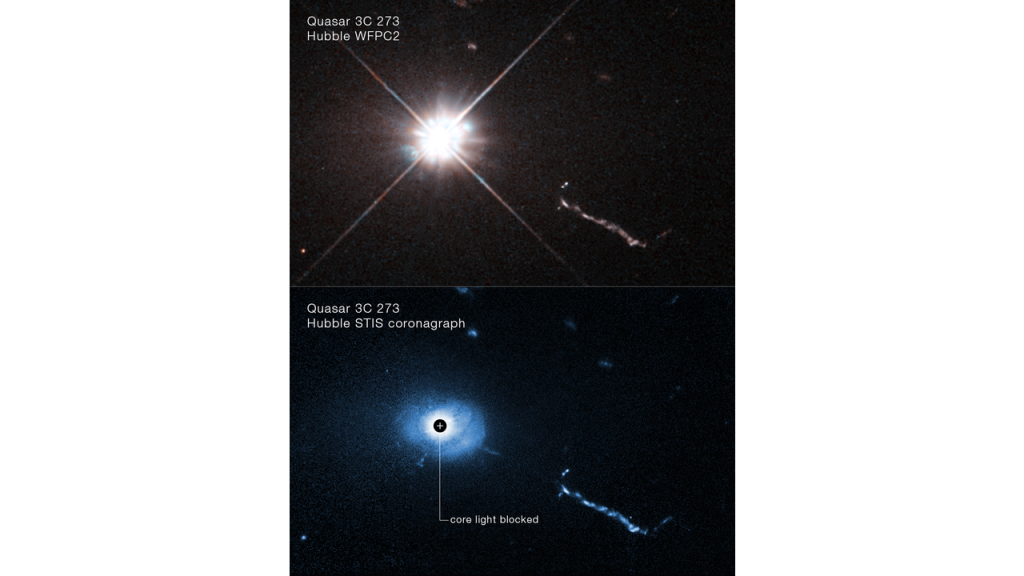 Il quasar nel nuovo studio, 3C 273, è stato identificato nel 1963 dall’astronomo Maarten Schmidt. Già nel 1994 Hubble lo osservò, rivelando che l’ambiente circostante fosse molto più complesso di quanto ci si aspettasse in precedenza. Per Hubble, fissare il quasar 3C 273 è come guardare direttamente un faro accecante di un’auto e cercare di vedere una formica che cammina sul bordo attorno ad esso. Il quasar riversa migliaia di volte l’intera energia delle stelle in una galassia. Uno dei quasar più vicini alla Terra, 3C 273 è a 2,5 miliardi di anni luce di distanza. Se fosse molto vicino, a poche decine di anni luce dalla Terra, apparirebbe luminoso come il Sole.