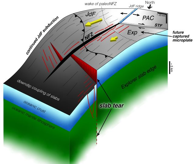 Al largo dell’isola di Vancouver, nella regione della Cascadia, gli scienziati hanno assistito allo svolgersi di questo “incidente”. Qui, le placche Juan de Fuca ed Explorer stanno lentamente scivolando sotto la placca nordamericana, e nuovi dati mostrano che il sistema si sta letteralmente lacerando. Per osservare il processo, i ricercatori hanno utilizzato l’imaging sismico a riflessione, essenzialmente un’ecografia dell’interno della Terra, combinata con registrazioni dettagliate dei terremoti. Le immagini risultanti hanno rivelato profonde fratture nei punti in cui la placca oceanica si sta rompendo.