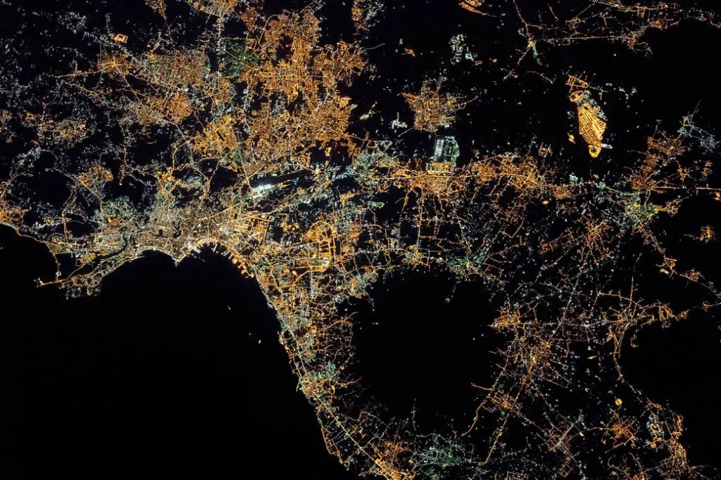 L’equipaggio a bordo della Stazione Spaziale Internazionale ha scattato questa fotografia delle luci della città di Napoli e della Campania. La regione di Napoli è una delle più luminose del Paese: circa tre milioni di persone vivono in quest’area metropolitana e nei suoi dintorni. I diversi colori delle luci nella scena riflettono parte della storia dello sviluppo edilizio della zona. Le luci verdi sono lampadine a vapori di mercurio, una varietà più vecchia che è stata sostituita nei nuovi insediamenti da lampadine al sodio arancioni (giallo-arancio). A nord-est, gli spazi senza luce tra le case e le attività commerciali sono campi agricoli. Il complesso giallo-arancio brillante in mezzo ai campi è l’emporio CIS, il più grande centro commerciale al dettaglio d’Europa. La grande area circolare nera nella foto è il Vesuvio, l’unico vulcano attivo sull’Europa continentale.