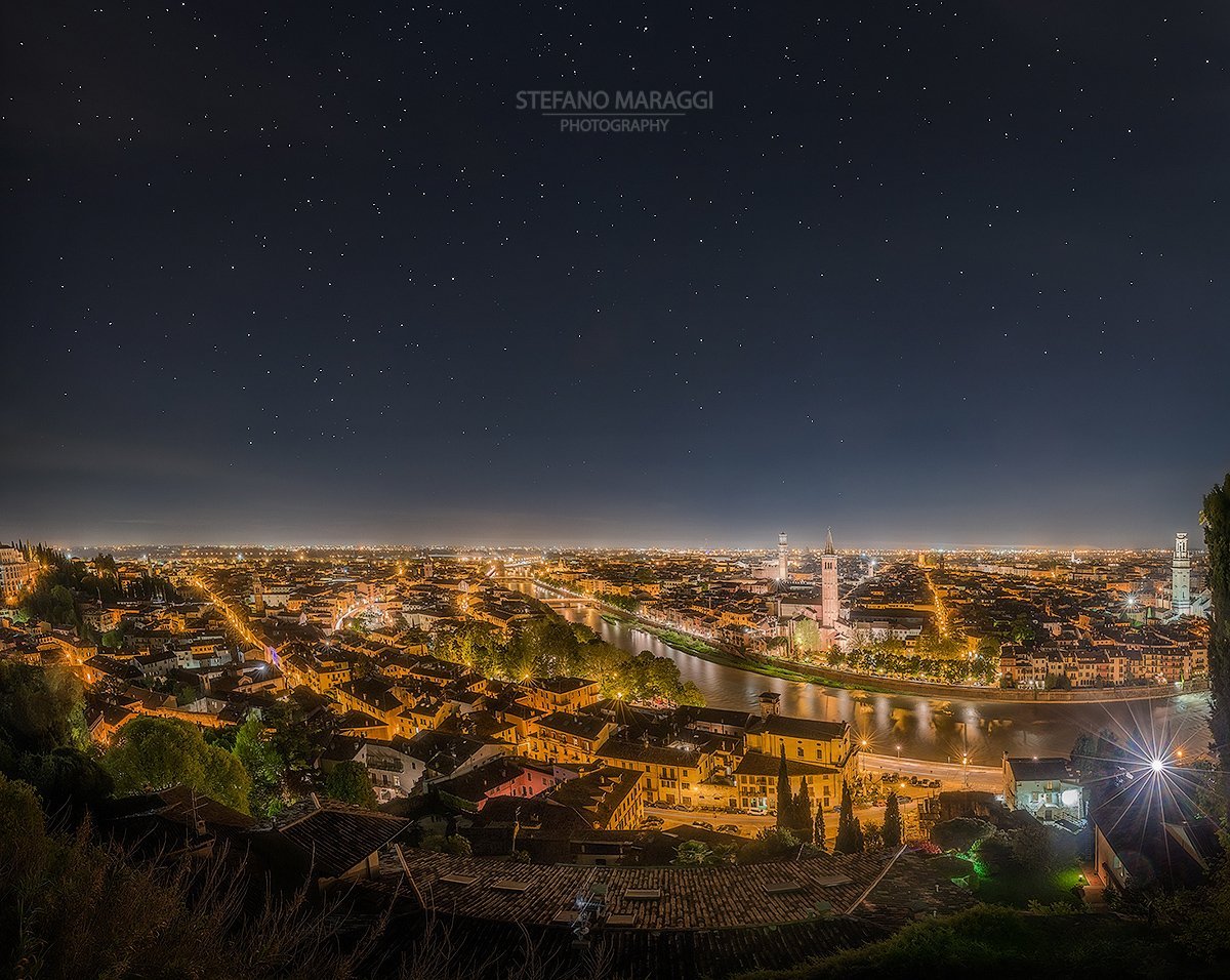 Eccoci con uno scorcio della città di Verona, da Castel San Pietro. Un luogo meraviglioso, che permette una vista panoramica della famosa città Veneta, addirittura a perdita d’occhio nelle giornate più terse. Nonostante la grande quantità di luci, con le giuste condizioni meteo, è possibile scorgere un favoloso tappeto di stelle, che regala un’atmosfera sognante alla città dell’amore.